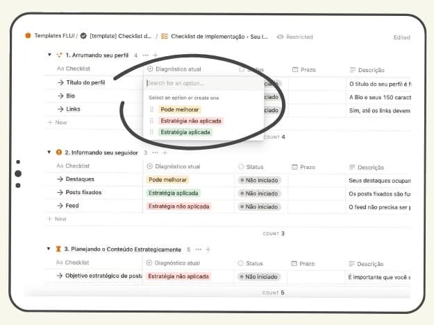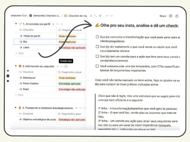 Checklist no notion com 30 tópicos com tarefas práticas para você analisar seu instagram e aplicar as melhorias necessárias