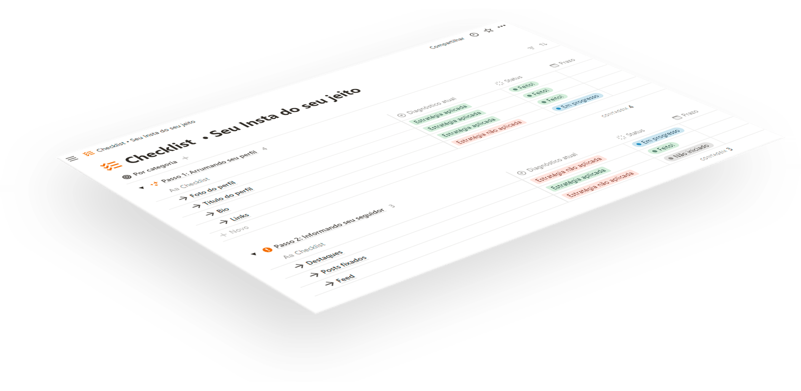 Cada item do checklist tem uma lista de tarefas simples pra você executar e deixar seu instagram mais profissional, atraente e estratégico