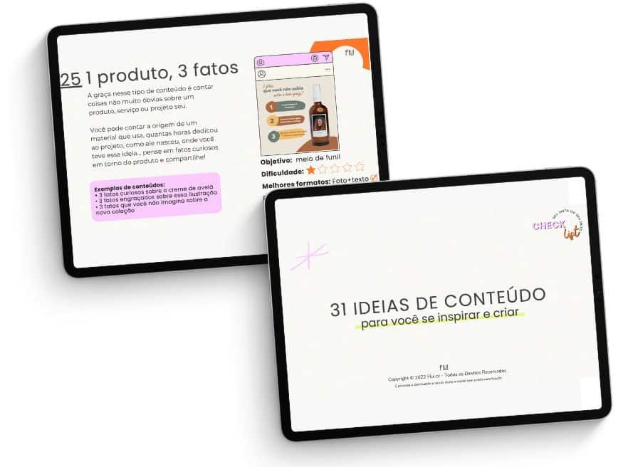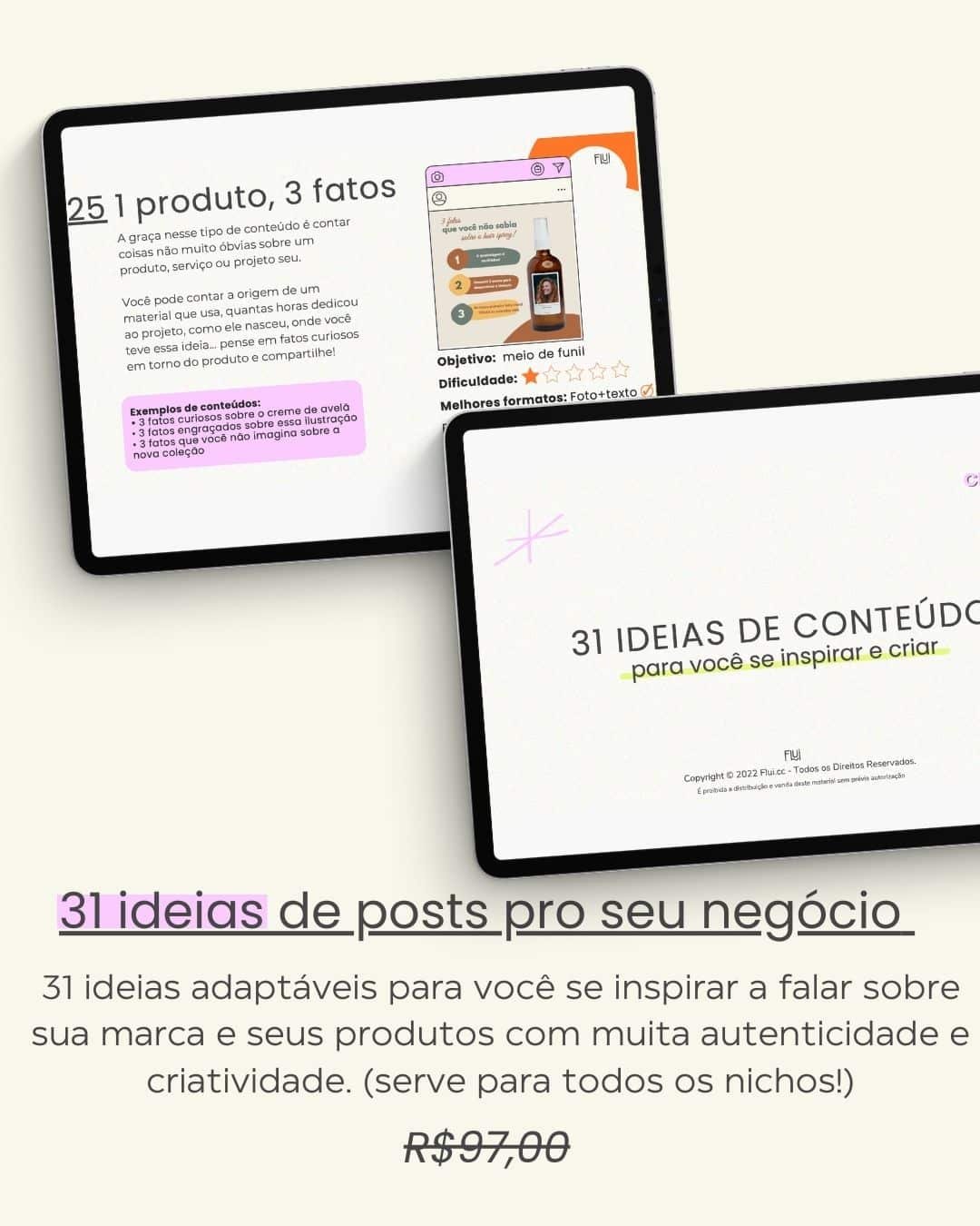 Nem sempre é fácil ter ideias do que postar e por isso criei pra você um material com 31 ideias adaptáveis a qualque tema de conteúdo para você se inspirar a falar sobre sua marca e seus produtos com muita autenticidade e criatividade. (serve para todos os nichos!)