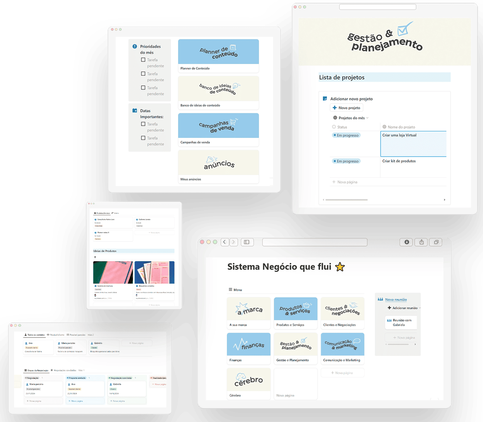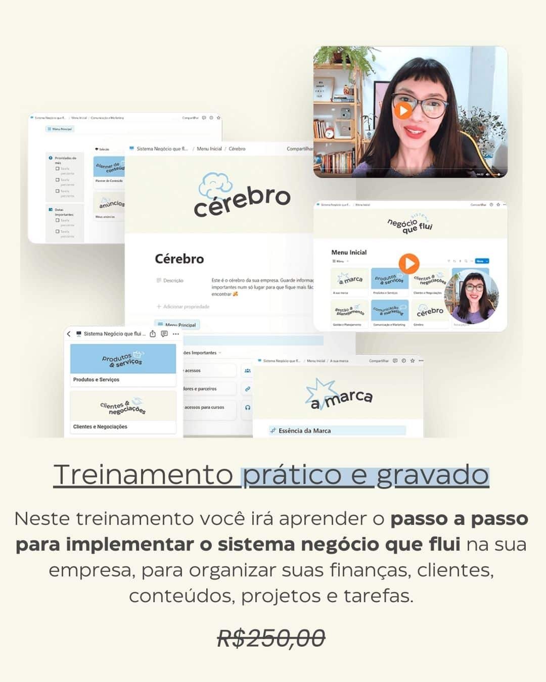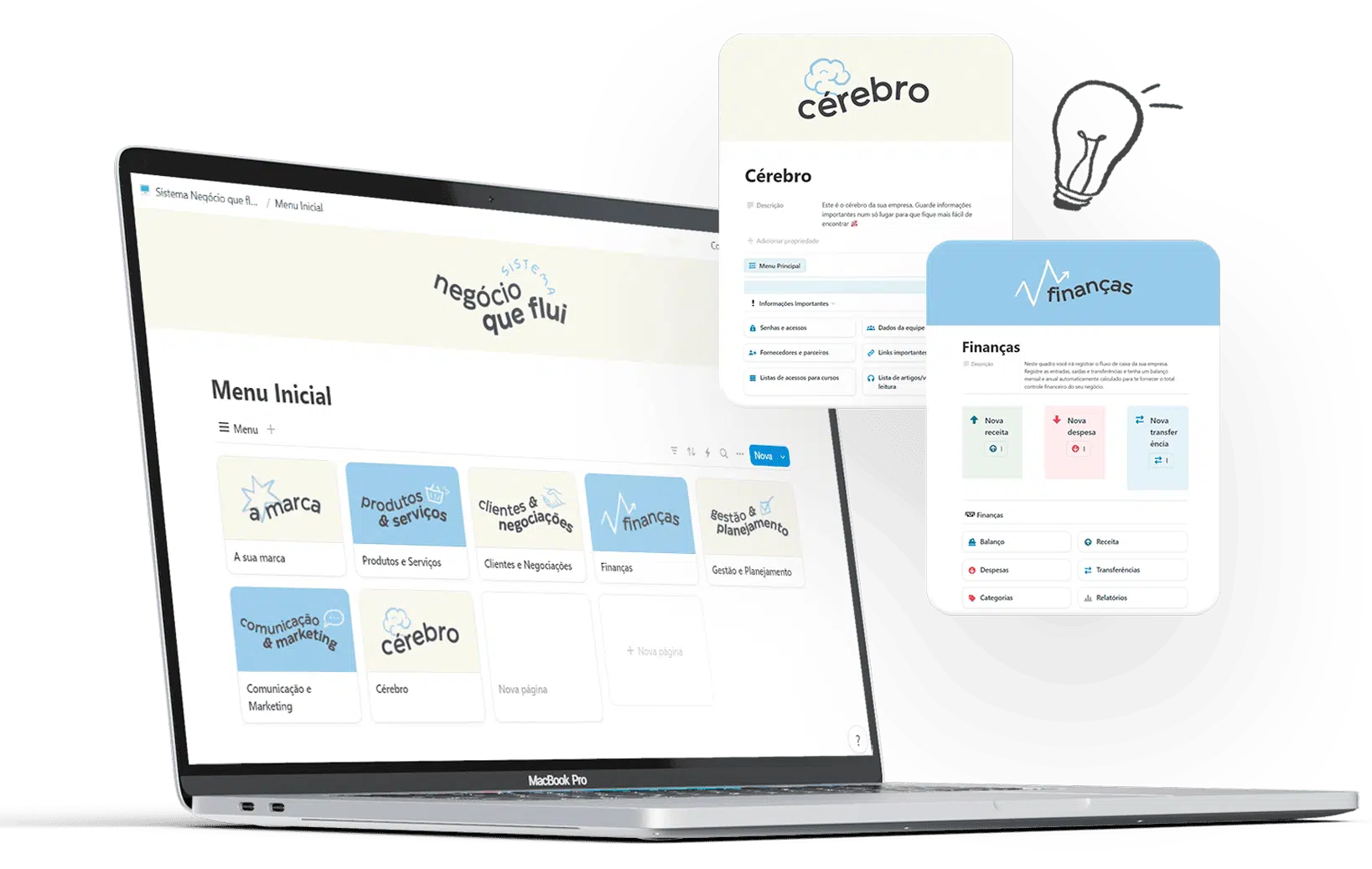 Com o método do Sistema Negócio que Flui e templates prontos, você vai estruturar todo seu negócio: gerir suas tarefas, acompanhar clientes, finanças e planejar e criar conteúdos com clareza e leveza, e finalmente ter tempo para focar no que realmente importa: fazer sua empresa crescer.