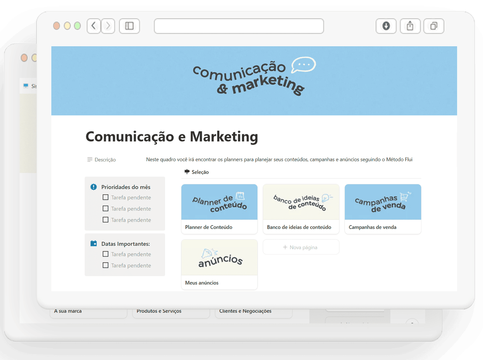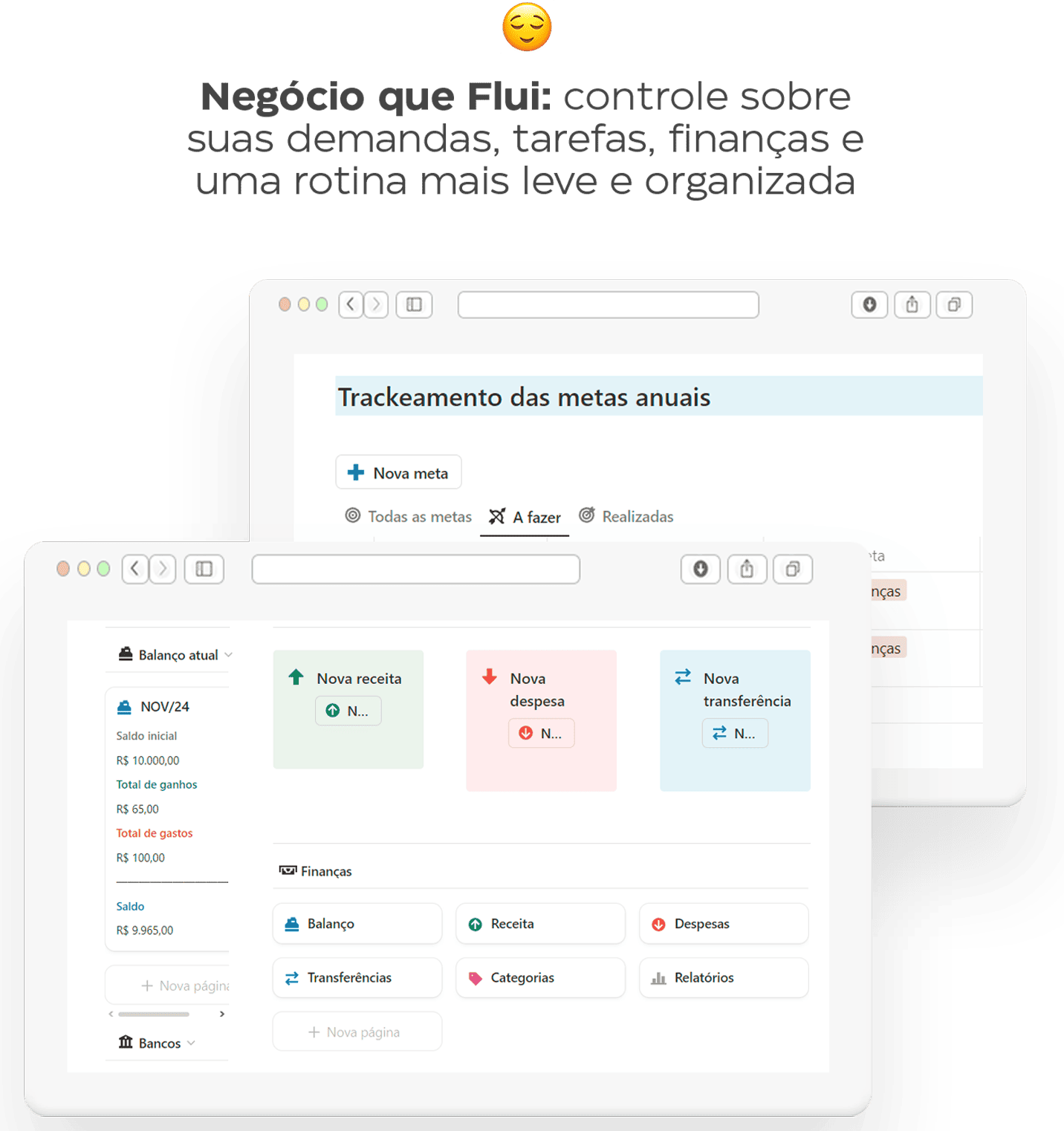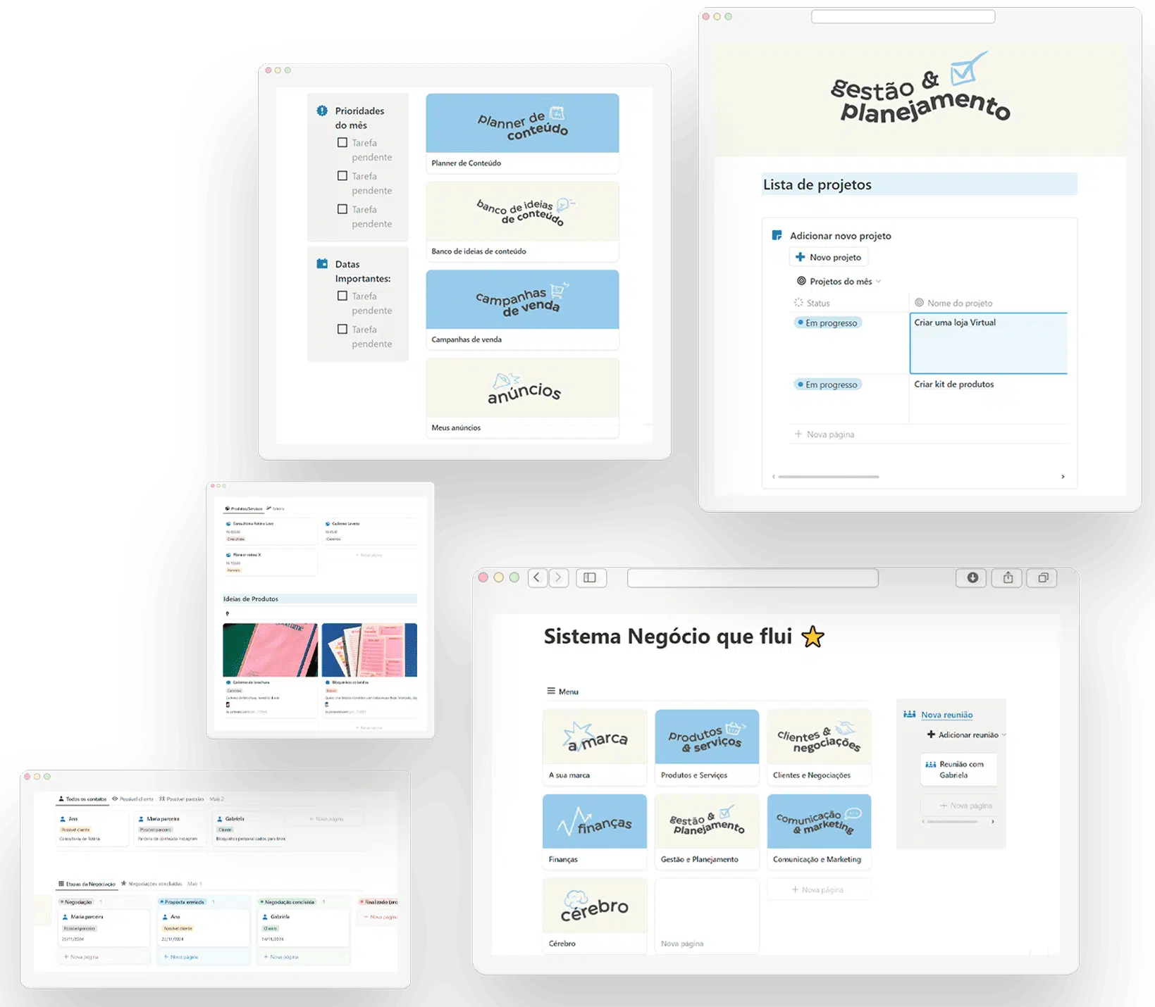 Com o método do Sistema Negócio que Flui e templates prontos, você vai estruturar todo seu negócio: gerir suas tarefas, acompanhar clientes, finanças e planejar e criar conteúdos com clareza e leveza, e finalmente ter tempo para focar no que realmente importa: fazer sua empresa crescer.