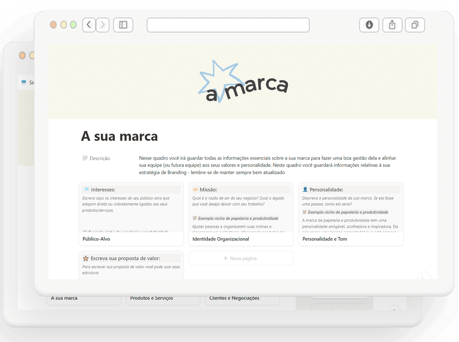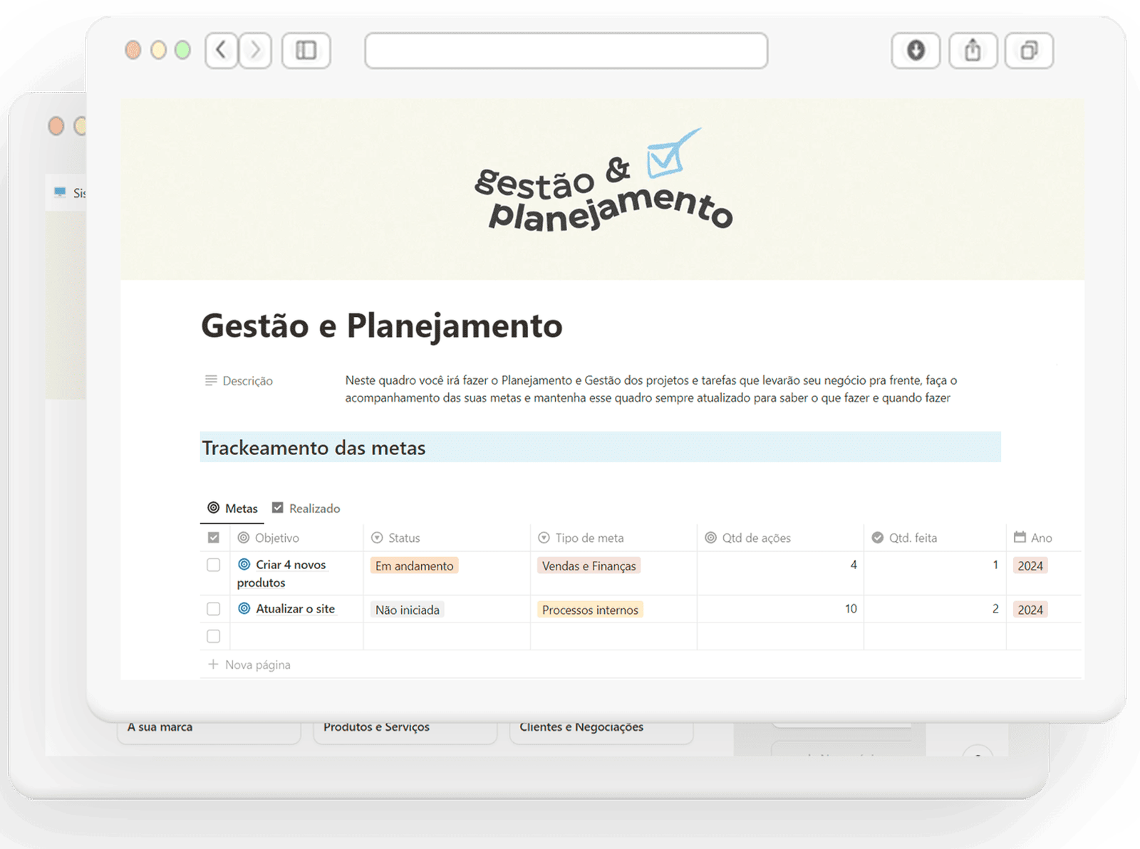 Chega de se sentir perdida. No quadro de Gestão e Planejamento, você define metas anuais, organiza projetos e tarefas de cada mês e semana num cronograma fácil de acompanhar. Além disso, registre aprendizados e insights no Diário da Marca e Lições Aprendidas, garantindo evolução constante para o seu negócio – e pra você também!
