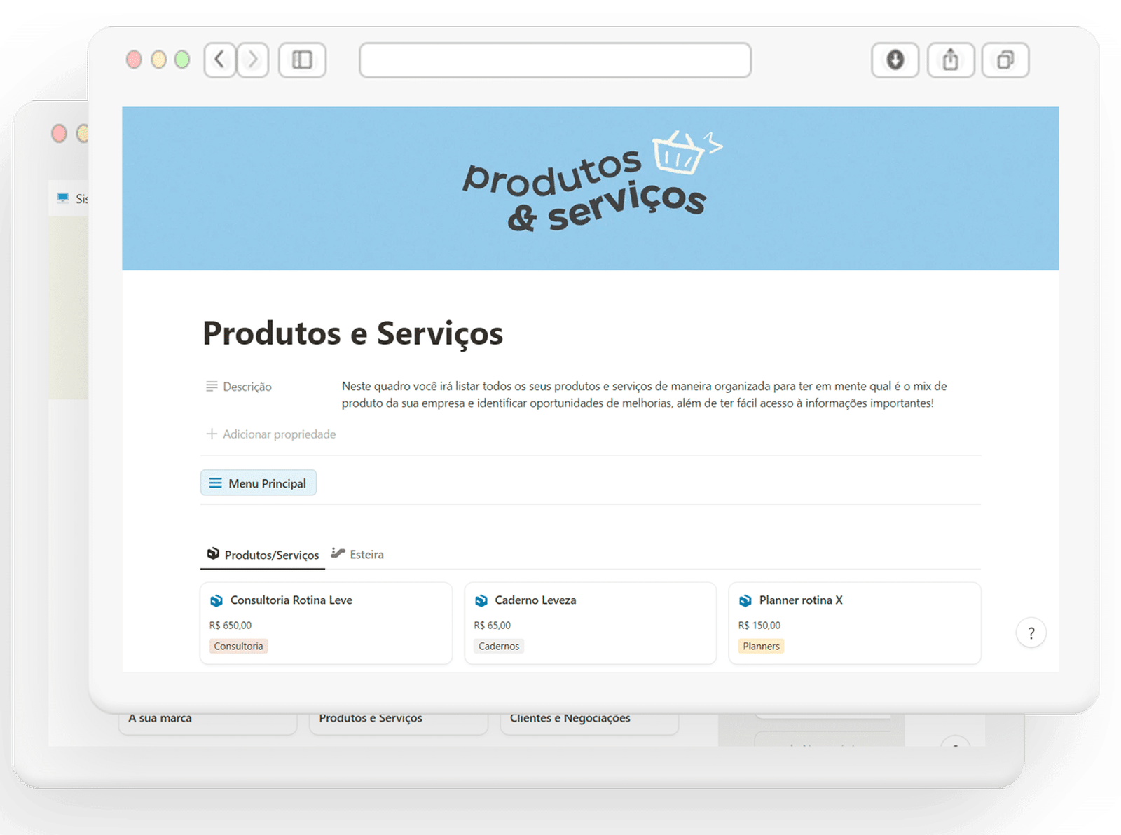 Tenha total controle sobre o que você vende! No quadro de produtos e serviços, registre seu portfólio, organize categorias, acompanhe estoque, vendas e faturamento para saber o que te traz mais retorno! Liste ideias de melhorias, campanhas e até novos lançamentos com espaço para referências e insights. Transforme suas ideias em produtos ou serviços que fazem seu negócio crescer!