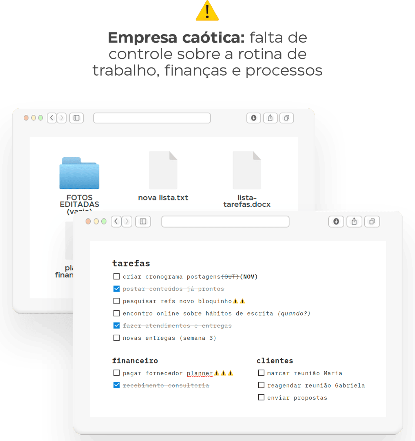 Comece agora a organizar seu negócio de forma estratégica, ganhe mais controle sobre suas tarefas e processos e prepare-se para crescer sem abrir mão do seu bem-estar ✨